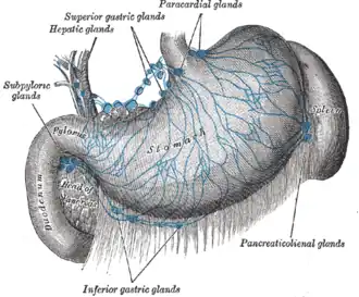 ![]() Lymphatics of stomach, etc. The stomach has been turned upward. | |