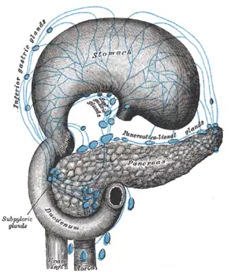 Their afferents are derived from the stomach, spleen, and pancreas. The splenic lymph nodes empty into the suprapancreatic, infrapancreatic and omental lymph nodes, which then drain to the coeliac nodes and cisterna chyli.[1][2]
