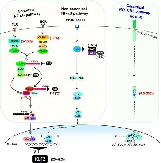 - ↑ Du, Ming-Qing (1 November 2015). "Pathogenesis of splenic marginal zone lymphoma". Pathogenesis. 2 (4): 11–20. doi:10.1016/j.pathog.2015.07.001. ISSN 2214-6636.