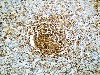 - ↑ Savilo E, Campo E, Mollejo M, et al. (July 1998). "Absence of cyclin D1 protein expression in splenic marginal zone lymphoma". Mod. Pathol. 11 (7): 601–6. PMID 9688179.