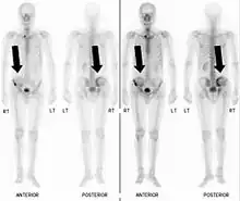 Also known as a bone scan, bone scintigraphy involves the injection of a small amount of radioactive tracer into the bloodstream. This tracer decays and emits radioactive energy which can be detected by a special camera. The camera produces a black and white image where areas shown as dark black indicate bone damage of some kind. If there is a black spot in the lumbar vertebrae (e.g. L5) this indicates damage and potentially spondylolysis. If this test is positive, a CT scan is usually ordered to confirm spondylolysis.[13]
