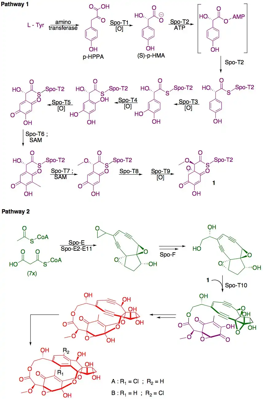 The biosynthesis of sporolide A and B is related to that of enediynes such as dynemicin A[4] and is proposed to proceed as shown below.[1][3]