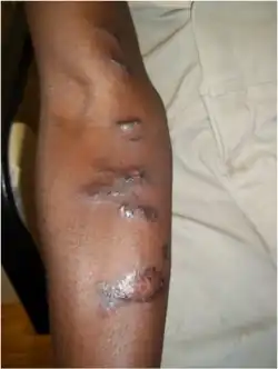 - ↑ 2.0 2.1 2.2 2.3 Vásquez-del-Mercado E, Arenas R, Padilla-Desgarenes C (July 2012). "Sporotrichosis". Clin. Dermatol. 30 (4): 437–43. doi:10.1016/j.clindermatol.2011.09.017. PMID 22682194.