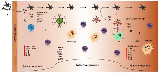 {{cite journal}}: CS1 maint: unflagged free DOI (link) - ↑ 26.0 26.1 26.2 26.3 26.4 26.5 Carlos IZ, Sassá MF, da Graça Sgarbi DB, Placeres MC, Maia DC (July 2009). "Current research on the immune response to experimental sporotrichosis". Mycopathologia. 168 (1): 1–10. doi:10.1007/s11046-009-9190-z. PMID 19241140. S2CID 39610.