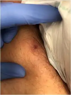 A spotted fever is a type of tick-borne disease which presents on the skin.[1] They are all caused by bacteria of the genus Rickettsia. Typhus is a group of similar diseases also caused by Rickettsia bacteria, but spotted fevers and typhus are different clinical entities. Transmission process: When the tick latches on, it needs to be removed under 2 hours. If not noticed or unremoved it takes only 10 hours for the tick to transmit the (disease) to the human.