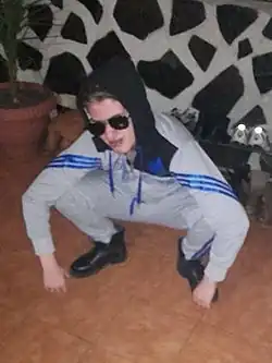 Equivalents to the Slav squat (see Gopnik) in Western culture, sometimes with the hands together in a prayer position, are the rap squat, prison pose, and jail pose. They are often used as photographic poses.[12][13][14]