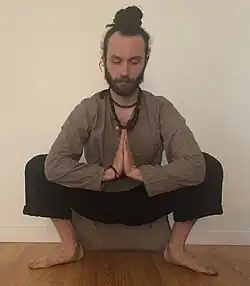 The āsana is a squat with heels flat on the floor and hip-width apart (or slightly wider if necessary), toes pointing out on a diagonal. The torso is brought forward between the thighs, elbows are braced against the inside of the knees, and the hands press together in front of the chest in Añjali Mudrā.[18]