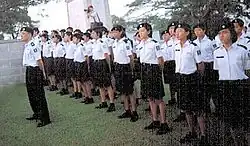 | Safari Uniform | A bush jacket with 4 big silver buttons in front, with epaulettes and metal rank insignias for both the men and the ladies. Medal ribbons are normally worn though full medals are sometimes worn during parades and ceremonies. Peak Cap or Beret is worn. | Same. Lady officers wear bowler hats or berets instead of peak caps and have the option of black culottes or slacks. |