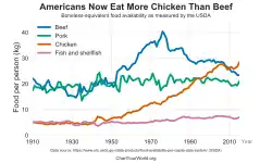 Consumption of beef in the US has fallen since the 1970s, while chicken consumption has grown dramatically. Fish and pork remain constant.