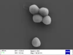 Staphylococcus haemolyticus is a member of the coagulase-negative staphylococci (CoNS).[2] It is part of the skin flora of humans,[3] and its largest populations are usually found at the axillae, perineum, and inguinal areas.[4] S. haemolyticus also colonizes primates and domestic animals.[4] It is a well-known opportunistic pathogen, and is the second-most frequently isolated CoNS (S. epidermidis is the first).[5] Infections can be localized or systemic, and are often associated with the insertion of medical devices.[6][7][8] The highly antibiotic-resistant phenotype and ability to form biofilms make S. haemolyticus a difficult pathogen to treat.[5] Its most closely related species is Staphylococcus borealis.[9]
