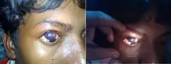 A staphyloma is an abnormal protrusion of the uveal tissue through a weak point in the eyeball.[1][2] The protrusion is generally black in colour, due to the inner layers of the eye. It occurs due to weakening of outer layer of eye (cornea or sclera) by an inflammatory or degenerative condition. It may be of five types, depending on the location on the eyeball (bulbus oculi).