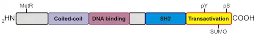 All seven STAT proteins share a common structural motif consisting of an N-terminal domain followed by a coiled-coil, DNA-binding domain, linker, Src homology 2 (SH2), and a C-terminal transactivation domain. Much research has focused on elucidating the roles each of these domains play in regulating different STAT isoforms. Both the N-terminal and SH2 domains mediate homo or heterodimer formation, while the coiled-coil domain functions partially as a nuclear localization signal (NLS). Transcriptional activity and DNA association are determined by the transactivation and DNA-binding domains, respectively.