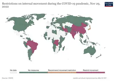 Numerous stay-at-home orders, curfews, quarantines, and similar restrictions were enforced globally in response to the COVID-19 pandemic.[36]