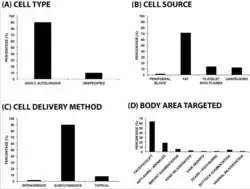 With the rising interest in stem cell cosmetic therapy, the adjacent figure demonstrates the content analysis on the 50 clinical websites that appeared on Google for "stem cell therapy", "treatment" or "stem cell facelift" in November 2013. The result showed that 90% of the clinics use autologous adult stem cells, 71% of clinics obtained stem cells from patient fat, 90% of procedures delivered cells through subcutaneous methods, and facial anti-ageing treatment was advertised the most in stem cell treatments as well as stem cell breast augmentation therapies.[21]