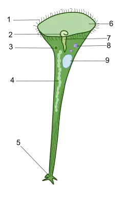 Diagram of the internal structures of a Stentor, highlighting the key organelles involved in its locomotion, feeding, and regeneration. 1 - cilia, 2 - oral pouch, 3 - micronucleus, 4 - macronuclear nodes, 5 - holdfast, 6 - peristome, 7 - gullet, 8 - food vacuole, 9 - contractile vacuole
