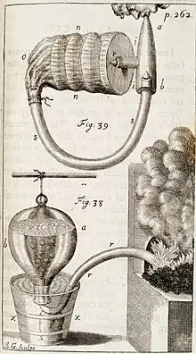 Hales also experimented with ways of distilling fresh water from sea water; preserving water and meat on sea-voyages; measuring depths at sea; measuring high temperatures; and wrote on a range of subjects including earthquakes; methods of preventing the spread of fires; and comparative mortality rates in relationship to rural and urban parishes.[27][28]