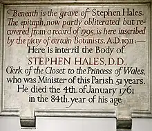 - ↑ Stephen Hales Archived 6 April 2018 at the Wayback Machine. Westminster Abbey. Retrieved on 15 June 2013.