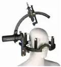 - Arc-phantom systems: An aiming bow attaches to the head ring, which is fixed to the patient's skull, and can be transferred to a similar ring that contains a simulated target. In this system, the phantom target is moved on the simulator to 3D coordinates. After adjusting the probe holder on the aiming bow so that the probe touches the desired target on the phantom, the transferable aiming bow is moved from the phantom base ring to the base ring on the patient. The probe is then lowered to the determined depth in order to reach the target point deep in the patient's brain.[4]