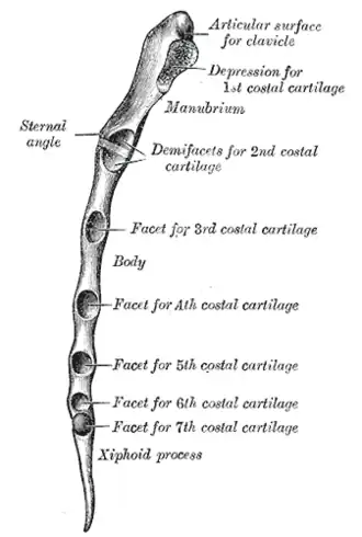 ![]() Anterior surface of sternum and costal cartilages. (Sternal angle not labeled, but visible at second costal cartilage.) | |