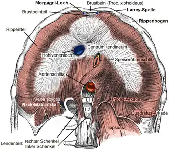 The sternocostal triangle (foramina of Morgagni, Larrey's space, sternocostal hiatus, etc.[1]) are small zones lying between the costal and sternal attachments of the thoracic diaphragm. No vascular elements are present within this space.[2] The borders of this space are: