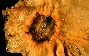 A stomach ulcer that was diagnosed as cancer on biopsy and surgically removed
