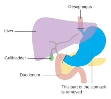 Surgery remains the only curative therapy for stomach cancer.[6] Of the different surgical techniques, endoscopic mucosal resection (EMR) is a treatment for early gastric cancer (tumor only involves the mucosa) that was pioneered in Japan and is available in the United States at some centers.[6] In this procedure, the tumor, together with the inner lining of stomach (mucosa), is removed from the wall of the stomach using an electrical wire loop through the endoscope. The advantage is that it is a much smaller operation than removing the stomach.[6] Endoscopic submucosal dissection (ESD) is a similar technique pioneered in Japan, used to resect a large area of mucosa in one piece.[6] If the pathologic examination of the resected specimen shows incomplete resection or deep invasion by tumor, the patient would need a formal stomach resection.[6] A 2016 Cochrane review found low quality evidence of no difference in short-term mortality between laparoscopic and open gastrectomy (removal of stomach), and that benefits or harms of laparoscopic gastrectomy cannot be ruled out.[76] Post-operatively, up to 70% of people undergoing total gastrectomy develop complications such as dumping syndrome and reflux esophagitis.[77] Construction of a "pouch", which serves as a "stomach substitute", reduced the incidence of dumping syndrome and reflux esophagitis by 73% and 63% respectively, and led to improvements in quality-of-life, nutritional outcomes, and body mass index.[77]