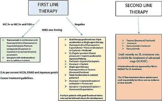 14. 14.0 14.1 14.2 14.3 14.4 14.5 14.6 Wagner AD, Syn NL, Moehler M, Grothe W, Yong WP, Tai BC, Ho J, Unverzagt S (August 2017). "Chemotherapy for advanced gastric cancer". The Cochrane Database of Systematic Reviews. 8: CD004064. doi:10.1002/14651858.cd004064.pub4. PMC 6483552. PMID 28850174.