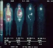 Sequence of 123-iodine human scintiscans after an intravenous injection: (from left) after 30 minutes, 20 hours and 48 hours. A high and rapid concentration of radio-iodine is evident in gastric mucosa of the stomach, in salivary glands, oral mucosa and in the periencephalic and cerebrospinal fluid (left). In the thyroid gland, I-concentration is more progressive, also in the reservoir (from 1% after 30 minutes to 5.8 % after 48 hours, of the total injected dose).[32]