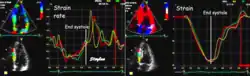 Strain rate imaging is a method in echocardiography (medical ultrasound) for measuring regional or global deformation of the myocardium (heart muscle). The term "deformation" refers to the myocardium changing shape and dimensions during the cardiac cycle. If there is myocardial ischemia, or there has been a myocardial infarction, in part of the heart muscle, this part is weakened and shows reduced and altered systolic function. Also in regional asynchrony, as in bundle branch block, there is regional heterogeneity of systolic function. By strain rate imaging, the simultaneous function of different regions can be displayed and measured. The method was first based on colour tissue Doppler.[1] by using the longitudinal myocardial velocity gradient, already in use transmurally.[2] Later, the regional deformation has also been available by speckle tracking echocardiography,[3][4] both methods having some, but different methodological weaknesses. Both methods, however, will acquire the same data (measurements may differ somewhat, however, being method dependent), and also can be displayed by the same type of display.