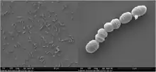 | Scanning electron microscopy of Streptococcus agalactiae (Scale bars, 2 and 30 μm, respectively) | |