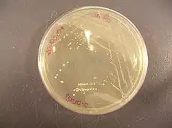 Individual cells of S. oralis are arranged into characteristic long chains when viewing subcultures under a microscope.[6] It is a non-motile, non-sporulating facultative anaerobe.[7] The optimal culturing temperature range for S. oralis is 35 - 37°C, with growth observed between 10 - 45°C.[7][8][9] Blood agars selective for streptococci, such as brain heart infusion blood agar, are optimal for culturing S. oralis as these plates highlight its α-haemolysis, but nutrient agars such as trypticase soy agar or Wilkins-Chalgren anaerobe agar can support its growth also.[7][8] S. oralis colonies are white, grey, or colourless; translucent; smooth; entire; raised cluster colonies 0.5-2.0 mm in diameter.[9]