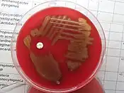 Optochin sensitivity in a culture of Streptococcus pneumoniae (white disk)