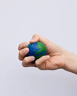 A stress ball or hand exercise ball is a malleable toy, usually not more than 7 centimetres (2.8 in) in diameter. It is squeezed in the hand and manipulated by the fingers, ostensibly to relieve stress and muscle tension or to exercise the muscles of the hand.