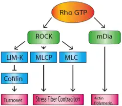 The Rho family of GTPases regulate many aspects of actin cytoskeletal dynamics, including stress fiber formation. RhoA (sometimes referred to as just 'Rho') is responsible for the formation of stress fibers, and its activity in stress fiber formation was first discovered by Ridley and Hall in 1992.[4] When bound to GTP, Rho activates Rho-associated coiled-coil forming kinase (ROCK) and mammalian homologue of Drosophila diaphanous (mDia).[5] mDia is a formin, which nucleates and polymerizes long actin filaments. ROCK is a kinase that acts to phosphorylate MLCP (myosin-light-chain phosphatase), as well as the NMMII light chain, which inactivates MLCP and activates myosin.[6] This will lead to the accumulation of activated myosin motor proteins, which bind the actin filaments that were polymerized by mDia, to create stress fibers. In addition, ROCK also phosphorylates and activates LIM-kinase.[7] LIM-kinase will in turn phosphorylate and inactivate cofilin, which will prevent the breakdown and recycling of actin filaments, maintaining the integrity of the stress fibers.[8]