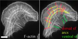 An essential feature of many cells is their ability to migrate towards certain mechanical (Durotaxis) or chemical (Chemotaxis) stimuli.[24] Cell migration takes place through the concerted action of three Rho family GTPases: Rho, Rac, and Cdc42. When GTP-bound, Rac will cause the formation of lamellipodia, and Cdc42 will cause the formation of filopodia, thus promoting cell migration. In the migrating cell, there are three main types of stress fibers: ventral stress fibers, transverse arcs, and dorsal stress fibers.[25] Ventral stress fibers are associated with focal adhesions at both ends, are located on the ventral surface of the cell, and function in adhesion and contraction.[26] Transverse arcs are not directly linked to focal adhesions, and typically flow from the leading edge of the cell, back towards the cell centre.[27] Dorsal stress fibers are located at the leading edge of the cell. They attach to focal adhesions on the ventral surface of the leading edge, and extend dorsally, towards the cell centre to attach to transverse arcs.[28] During cell migration, actin filaments within stress fibers will be recycled by a process of retrograde actin flow. The mechanism of dissolution of the focal adhesion itself is poorly understood.
