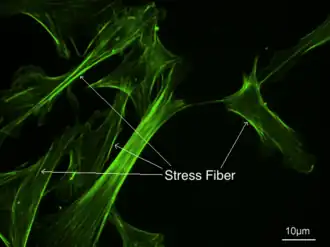 Stress fibers are contractile actin bundles found in non-muscle cells.[1] They are composed of actin (microfilaments) and non-muscle myosin II (NMMII), and also contain various crosslinking proteins, such as α-actinin, to form a highly regulated actomyosin structure within non-muscle cells.[2] Stress fibers have been shown to play an important role in cellular contractility, providing force for a number of functions such as cell adhesion, migration and morphogenesis.