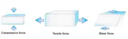 Compression, tension, and shear are the three main types of mechanical stimuli.[3][4] Compression force is when an object experiences forces from two sides, going in opposite directions, causing it to become compacted. Tensile force is when an object experiences forces from two sides, pointing in opposite directions, causing it to stretch. Shear forces are when an object experiences forces that are parallel and are going in opposite directions. Ultrasound and magnetic fields are also examples of mechanical forces.[5] Depending on the mechanical stimuli, a different material may improve the desired results.[2] The human body is exposed to mechanical forces on or within bones, organs, joints, blood vessels, and cartilage.[1][5]