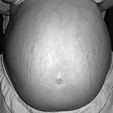 Pregnancy stretch marks, also known as striae gravidarum, are a specific form of scarring of the skin of the abdominal area due to rapid expansion of the uterus as well as sudden weight gain during pregnancy. About 90% of pregnant women are affected.[20]