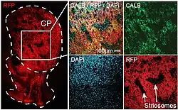 - ↑ Reinius B; et al. (March 27, 2015). "Conditional targeting of medium spiny neurons in the striatal matrix". Front. Behav. Neurosci. 9: 71. doi:10.3389/fnbeh.2015.00071. PMC 4375991. PMID 25870547.