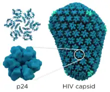 HIV-1 is composed of two copies of noncovalently linked, unspliced, positive-sense single-stranded RNA enclosed by a conical capsid composed of the viral protein p24, typical of lentiviruses.[9][10] The two copies of RNA strands are vital in contributing to HIV-1 recombination, which occurs during reverse transcription of viral replication. The containment of two copies of single-stranded RNA within a virion but the production of only a single DNA provirus is called pseudodiploidy.[11] The RNA component is 9749 nucleotides long[12][13] and bears a 5’ cap (Gppp), a 3’ poly(A) tail, and many open reading frames (ORFs).[14] Viral structural proteins are encoded by long ORFs, whereas smaller ORFs encode regulators of the viral life cycle: attachment, membrane fusion, replication, and assembly.[14]