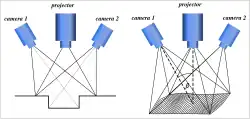 A typical measuring assembly consists of one projector and at least one camera. For many applications, two cameras on opposite sides of the projector have been established as useful.