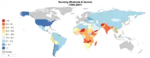 | World map of stunted growth for children in different countries (percentage moderate and severe stunting, 1995-2007) | |