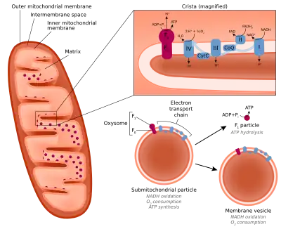A submitochondrial particle (SMP) is an artificial vesicle made from the inner mitochondrial membrane. They can be formed by subjecting isolated mitochondria to sonication, freezing and thawing, high pressure, or osmotic shock.[1][2] SMPs can be used to study the electron transport chain in a cell-free context.