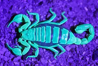 - ↑ Stachel SJ, Stockwell SA, Van Vranken DL (August 1999). "The fluorescence of scorpions and cataractogenesis". Chemistry & Biology. 6 (8): 531–539. doi:10.1016/S1074-5521(99)80085-4. PMID 10421760.