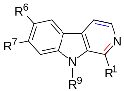 A substituted β-carboline, also known as a substituted 9H-pyrido[3,4-b]indole, is a chemical compound featuring a β-carboline moiety with one or more substitutions. β-Carbolines include more than one hundred alkaloids and synthetic compounds. The effects of these substances depend on their respective substituent. Natural β-carbolines primarily influence brain functions but can also exhibit antioxidant[1] effects. Synthetically designed β-carboline derivatives have recently been shown to have neuroprotective,[2] cognitive enhancing and anti-cancer properties.[3]