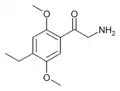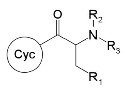 Substituted cathinones, or simply cathinones, which include some stimulants and entactogens, are derivatives of cathinone. They feature a phenethylamine core with an alkyl group attached to the alpha carbon, and a ketone group attached to the beta carbon, along with additional substitutions.[1][2][3][4][5] Cathinone occurs naturally in the plant khat whose leaves are chewed as a recreational drug.[6]