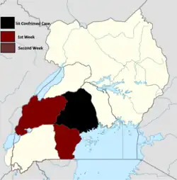 The 2022 Uganda Ebola outbreak is a current outbreak of the Ebola virus in Mubende District, Uganda. Twenty-three people are confirmed dead due to the virus, with a total of 36 of confirmed and suspected cases.[34] Uganda has previously had four outbreaks of Sudan ebolavirus; one outbreak in 2000 and 2011 and two outbreaks in 2012, as well as an outbreak of Bundibugyo virus disease in 2007 and an Ebola virus disease outbreak in 2019.[35]