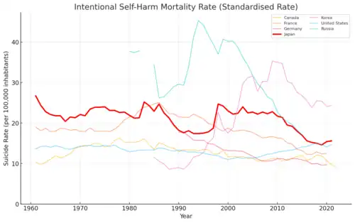 - ↑ "Suicide prevention in Japan: a public health priority". World Health Organization. Retrieved 26 January 2025.