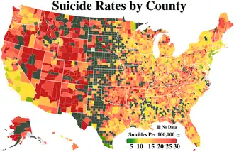 There are significant variations in the suicide rates of the different states,[16] ranging from 28.89 per 100,000 people in Montana to 8.11 per 100,000 people in New York.[17]