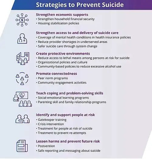 Suicide prevention is a collection of efforts to reduce the risk of suicide.[1] Suicide is often preventable,[2] and the efforts to prevent it may occur at the individual, relationship, community, and society level.[1] Suicide is a serious public health problem that can have long-lasting effects on individuals, families, and communities. Preventing suicide requires strategies at all levels of society. This includes prevention and protective strategies for individuals, families, and communities. Suicide can be prevented by learning the warning signs, promoting prevention and resilience, and committing to social change.[3]